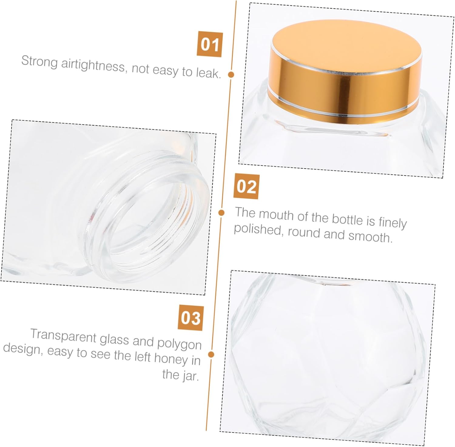 Package Include 4 x Honey Jars Features - Size: 12.00X12.00X7.00cm/4.72X4.72X2.75 inch Clear . - Capacity: 380ml Bee Honey Bottle. - Material: Glass Sealing . - Color: Golden, silver, transparent Glass . - A suitable size to provide convenience for your daily use. Hexagonal shape make the glass jar more fashion and tasteful Bee . - transparent glass bottle to hold the honey for longer time Honey Clear Jar. - It is made from material for long time and use Glass Honey Bottle. - The excellent workmanship of our product will bring you a Clear Jars. - Transparent glass and , the left honey in the jar Home Honey Bottle.Goods InformationSealing Those which has large capacity are inconvenient for use every time you take the honey out.Transparent Honey Bottle love eating honey or do some food with honey? Then you can choose this to store your honey.Honey Clear Jar Then this honey dispensed bottle can offer more convenient experience